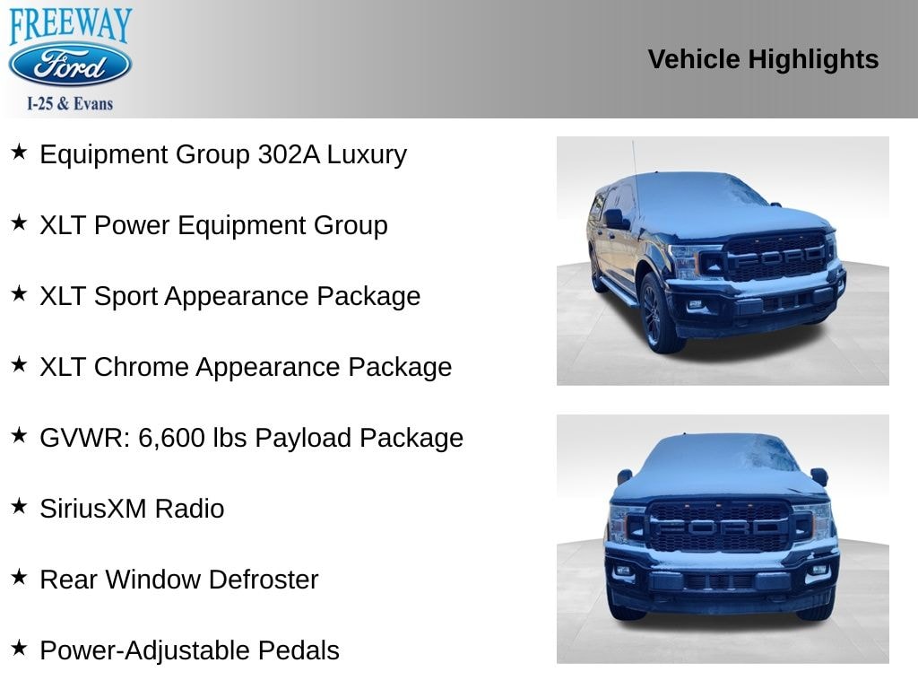 4WD, 10-Way Power Driver & Passenger Seats, 2-Bar Style Grille w/2 Minor Bars Painted Dark, 4.2" Productivity Screen in Instrument Cluster, Accent-Color Step Bars, Body-Color Door & Tailgate Handles, Body-Color Front & Rear Bumpers, Box Side Decals, Cloth 40/20/40 Front Seat, Equipment Group 302A Luxury, Fixed Backlight w/Privacy Glass, GVWR: 6,600 lbs Payload Package, Heated Front Seats, Leather-Wrapped Steering Wheel, LED Box Lighting, Power Glass Heated Sideview Mirrors, Power-Adjustable Pedals, Power-Sliding Rear Window, Rear Under-Seat Storage, Rear Window Defroster, Remote Start System, Single-Tip Chrome Exhaust, SiriusXM Radio, Wheels: 18" 6-Spoke Machined-Aluminum, XLT Chrome Appearance Package, XLT Power Equipment Group, XLT Sport Appearance Package.
