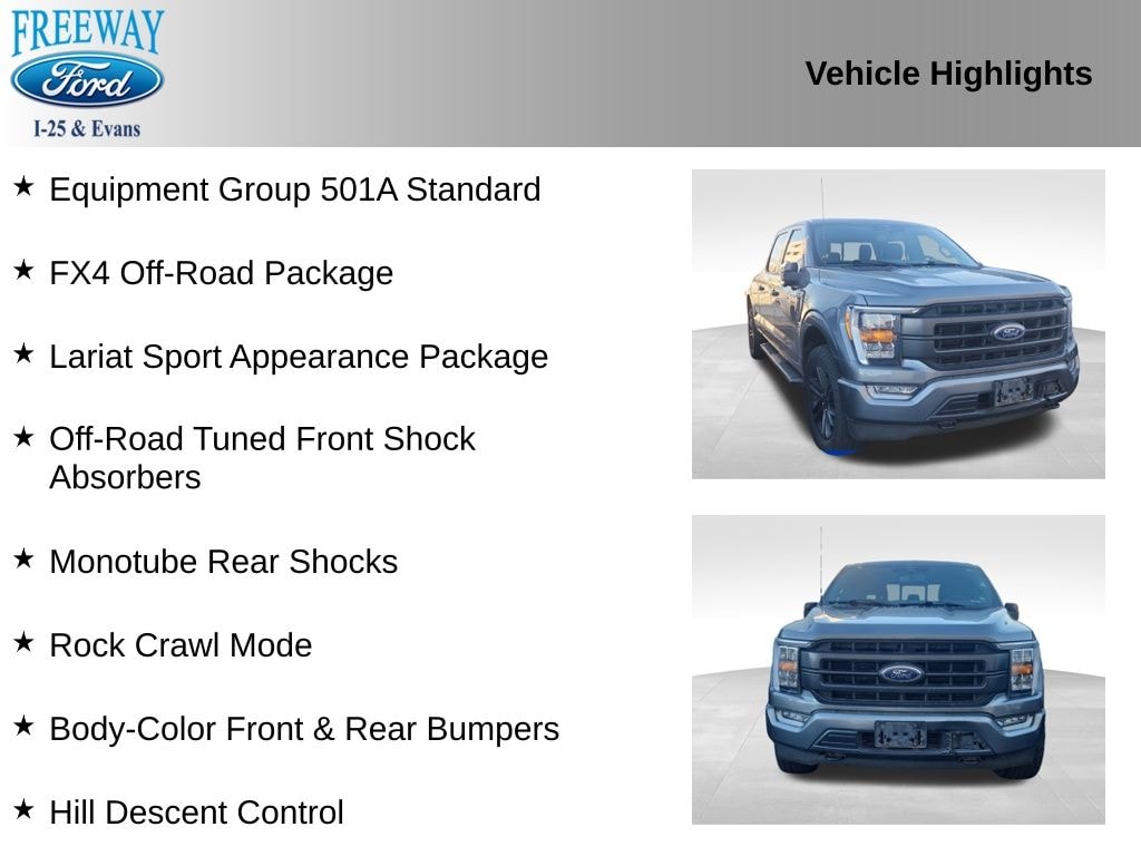 4WD, 4x4 FX4 Off-Road Bodyside Decal, Accent-Color Angular Step Bars, Body-Color Front & Rear Bumpers, Box Side Decals, Chrome Single-Tip Exhaust, Dark 2-Bar & 1 Minor Bar Style Grille, Electronic Locking w/3.31 Axle Ratio, Equipment Group 501A Standard, FX4 Off-Road Package, Hill Descent Control, Lariat Sport Appearance Package, Monotube Rear Shocks, Off-Road Tuned Front Shock Absorbers, Rock Crawl Mode, Wheels: 20" 6-Spoke Dark Alloy Painted Aluminum.