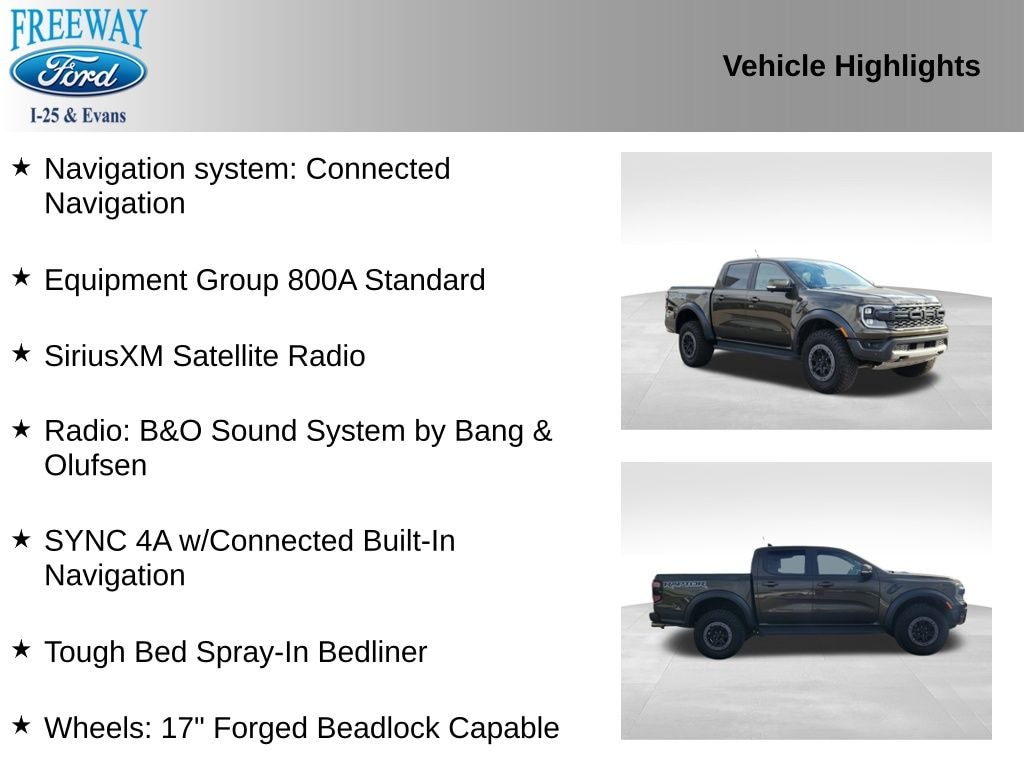 4WD, Equipment Group 800A Standard, Navigation system: Connected Navigation, Radio: B&O Sound System by Bang & Olufsen, SiriusXM Satellite Radio, SYNC 4A w/Connected Built-In Navigation, Tough Bed Spray-In Bedliner, Wheels: 17" Forged Beadlock Capable.