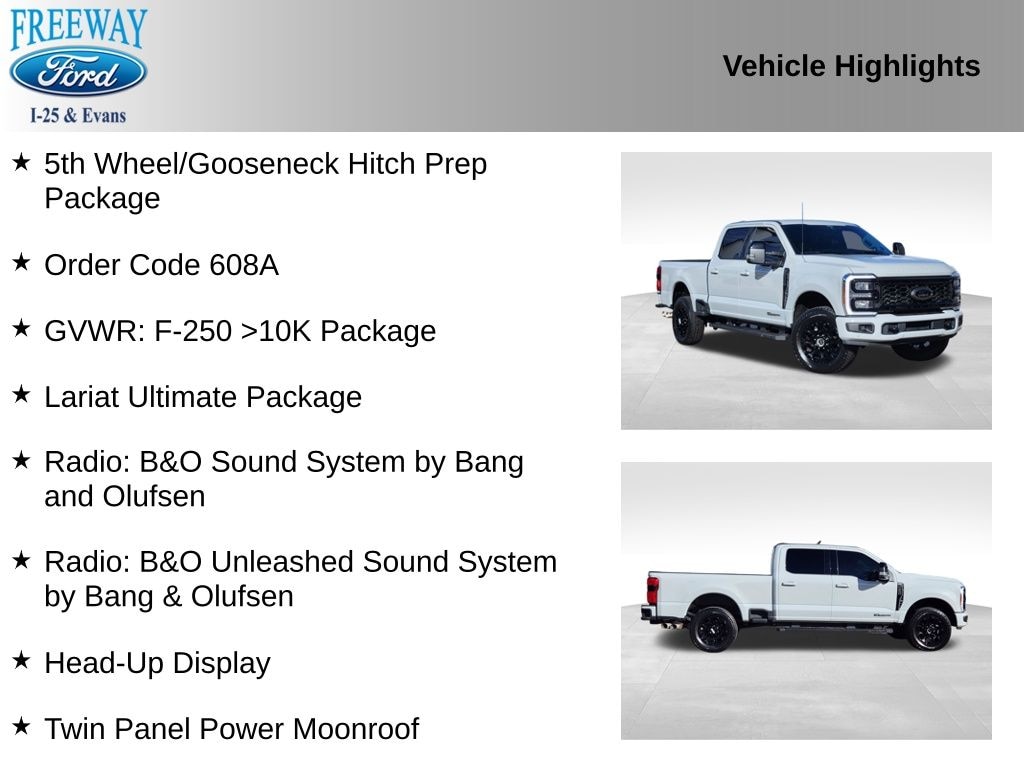 4WD, 4-Way Adjustable Headrests, 5th Wheel/Gooseneck Hitch Prep Package, Electronic-Locking with 3.31 Axle Ratio, Front ActiveX Trimmed 40/Console/40 Seats, GVWR: F-250 >10K Package, Head-Up Display, Lariat Ultimate Package, Order Code 608A, Power-Deployable Running Boards, Power-Sliding Rear-Window with Defrost, Pro Trailer Backup Assist, Pro Trailer Hitch Assist, Radio: B&O Sound System by Bang and Olufsen, Radio: B&O Unleashed Sound System by Bang & Olufsen, Tailgate Step and Handle, Twin Panel Power Moonroof, Wheels: 18" Bright Machined and Carbonized Gray Aluminum.
