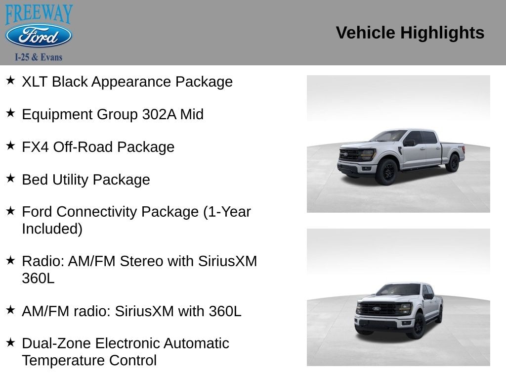 4WD, 360 Degree Camera, 4 Pickup Box Tie-Down Plates, 400W Pro Power Onboard (cab & Bed), 4x4 FX4 Off-Road Bodyside Decal, Adaptive Cruise Control with Stop and Go, AEB Oncoming, AM/FM radio: SiriusXM with 360L, Auto-Dimming Rear-View Mirror, Bed Storage Boxes, Bed Utility Package, Body-Color Front and Rear Bumpers, Bumpers: body-color, Dual-Zone Electronic Automatic Temperature Control, Electronic Locking with 3.31 Axle Ratio, Equipment Group 302A Mid, Ford Co-Pilot360 Assist 2.0, Ford Connectivity Package (1-Year Included), Front fog lights, Front Parking Sensors, Fully automatic headlights, FX4 Off-Road Package, Heated Front Seats, Hill Descent Control, Intelligent Access with Push Button Start, LED Box Lighting, Monotube Rear Shocks, Off-Road Tuned Front Shock Absorbers, Power Glass Heated Sideview Mirrors, Power-Sliding Rear Window, Radio: AM/FM Stereo with SiriusXM 360L, Remote Start System with Remote Tailgate Release, Rock Crawl Mode, SYNC 4 with Enhanced Voice Recognition, Tailgate Step with Work Surface, Towing Technology, Tray Style Floor Liner Without Carpet Mats, Unique Sport Cloth 40/Console/40 Front-Seats, Wheels: 18" Gloss Black, Wrapped Steering Wheel, XLT Black Appearance Package.