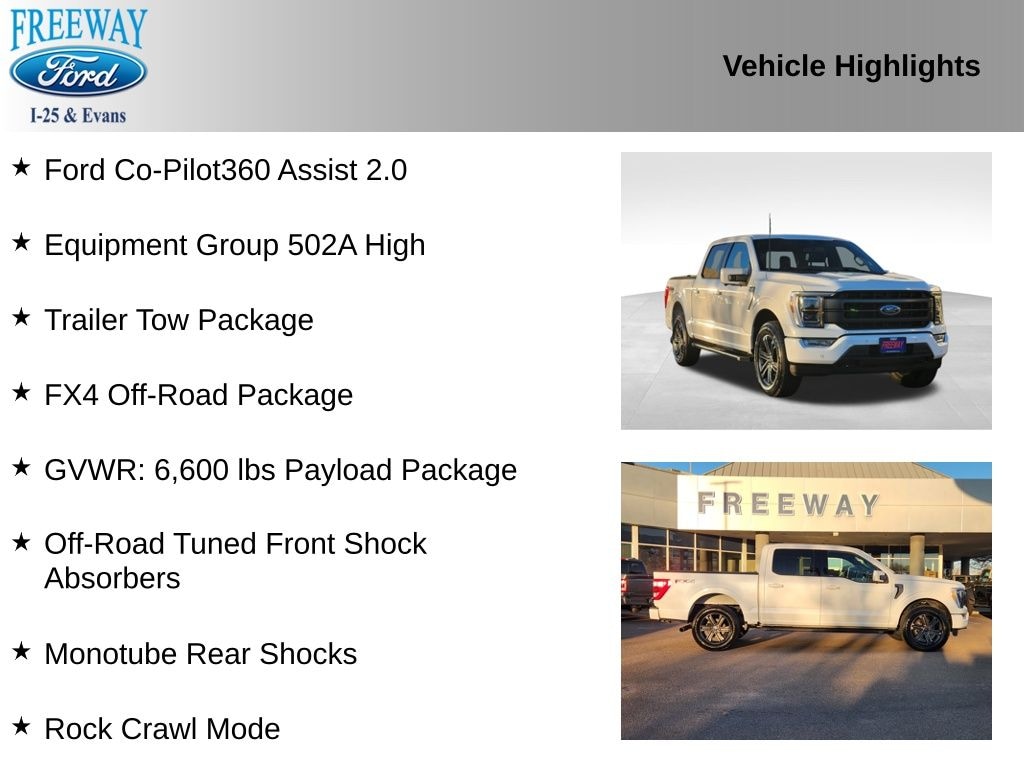 4WD, 2nd Row Heated Seats, 4x4 FX4 Off-Road Bodyside Decal, Class IV Trailer Hitch Receiver, Equipment Group 502A High, Ford Co-Pilot360 Assist 2.0, FX4 Off-Road Package, GVWR: 6,600 lbs Payload Package, Hill Descent Control, Integrated Trailer Brake Controller, LED Projector w/Dynamic Bending Headlamps, Monotube Rear Shocks, Off-Road Tuned Front Shock Absorbers, Power Tilt/Telescoping Steering Column w/Memory, Pro Trailer Backup Assist & Pro Trailer Hitch Assist, Rain-Sensing Wipers, Rock Crawl Mode, Trailer Tow Package, Wheels: 20" Chrome-Like PVD, Wireless Charging Pad.