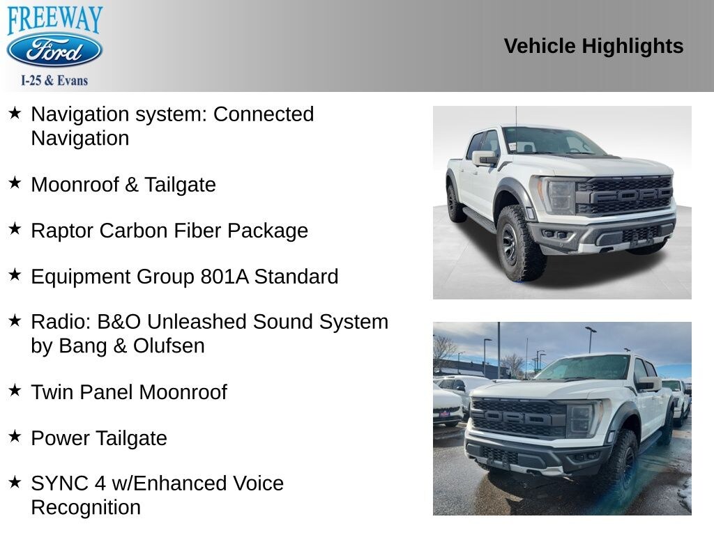 4WD, Equipment Group 801A Standard, Moonroof & Tailgate, Navigation system: Connected Navigation, Power Tailgate, Radio: B&O Unleashed Sound System by Bang & Olufsen, Raptor Carbon Fiber Package, SYNC 4 w/Enhanced Voice Recognition, Twin Panel Moonroof.