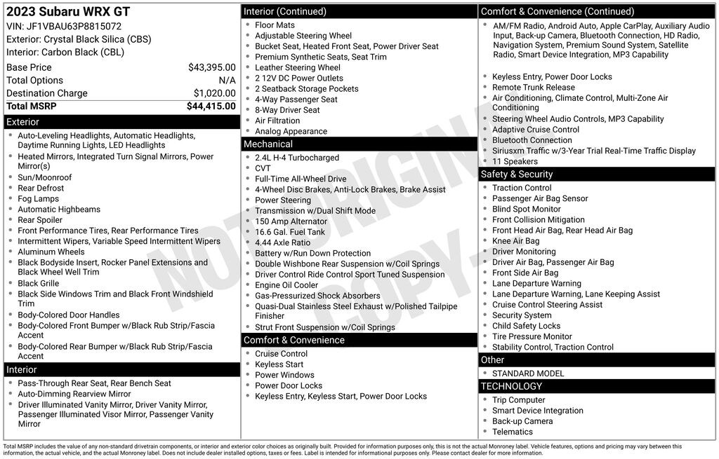 Crystal Black Silica 2023 Subaru WRX GT AWD CVT 2.4L DOHC